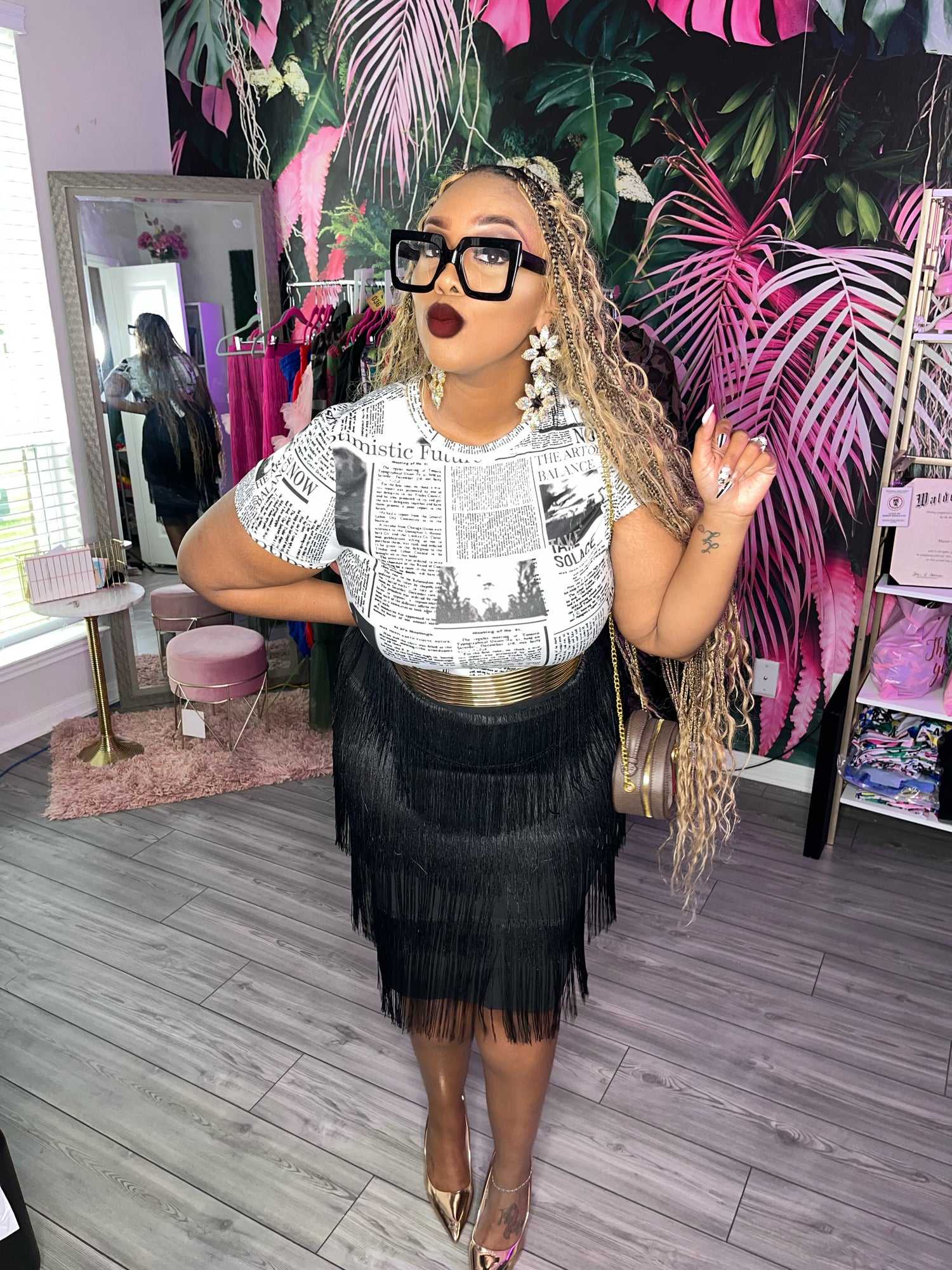 Our popular vibrant tassel fringe skirt, available in hot pink and black, with layered tassels that create a fun, flirty movement. The high-waisted, form-fitting design accentuates curves while adding elegance. Completing the look is a wide metallic gold waist belt, which adds a chic, stylish accent to the overall ensemble.