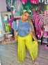 These wide-leg ruffle pants are a bold and vibrant fashion statement, combining style and comfort. The bright lime green hue adds an eye-catching pop of color, perfect for standing out. The flowy, tiered ruffle design gives the pants added volume and movement, creating a dynamic silhouette. Paired here with a denim top, these pants bring a fun, playful energy to the outfit, ideal for someone looking to make a stylish and unique impression.